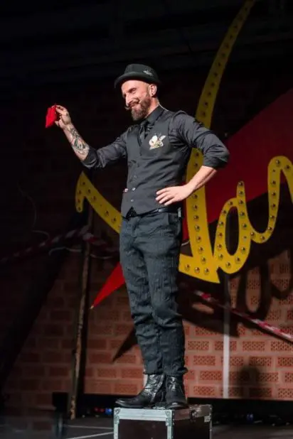 Jako iluzjonista, Pan Ząbek nie ogranicza się do sceny – wkracza wśród gości, nawiązując bezpośredni kontakt.